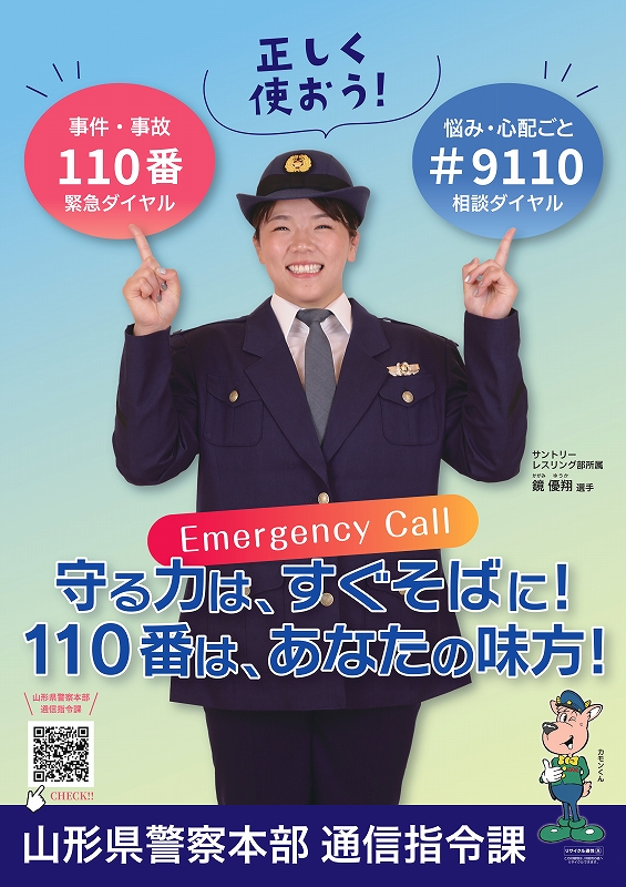 「110番」の広報啓発ポスターには、サントリーレスリング部に所属する「鏡優翔選手」を起用させていただきました。