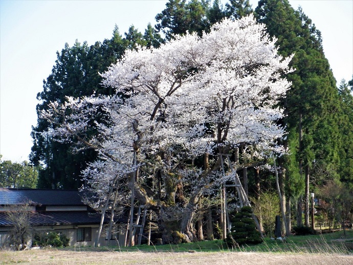 長井市草岡中里に生育するエドヒガンの巨木で、目通り周囲10.9m、樹高18.8m、枝張りは東西方向25m、南北方向22mと大きく枝を広げていて、人里に植栽された単幹のサクラとしては国内最大級の太さである。 元の主幹は腐朽し空洞化しているものの、旺盛に発達した不定根により樹体が維持されている。地元では古くから種蒔桜と称し、春の籾の播種の目安とされている。 |